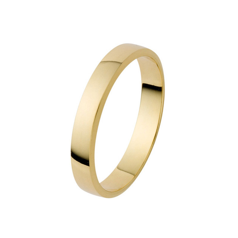 Alliance or jaune 18K d'une largeur de 3mm. Le poids d'or est de 2.51g. La finition est ruban