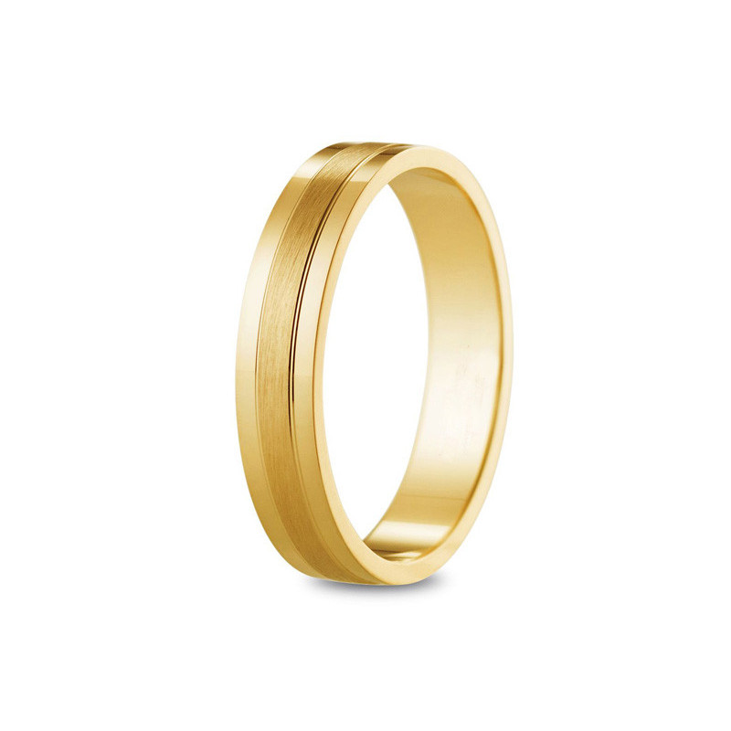 Alliance or jaune 18K d'une largeur de 4mm. Le poid d'or est de 4.49g. La finition est brossée
