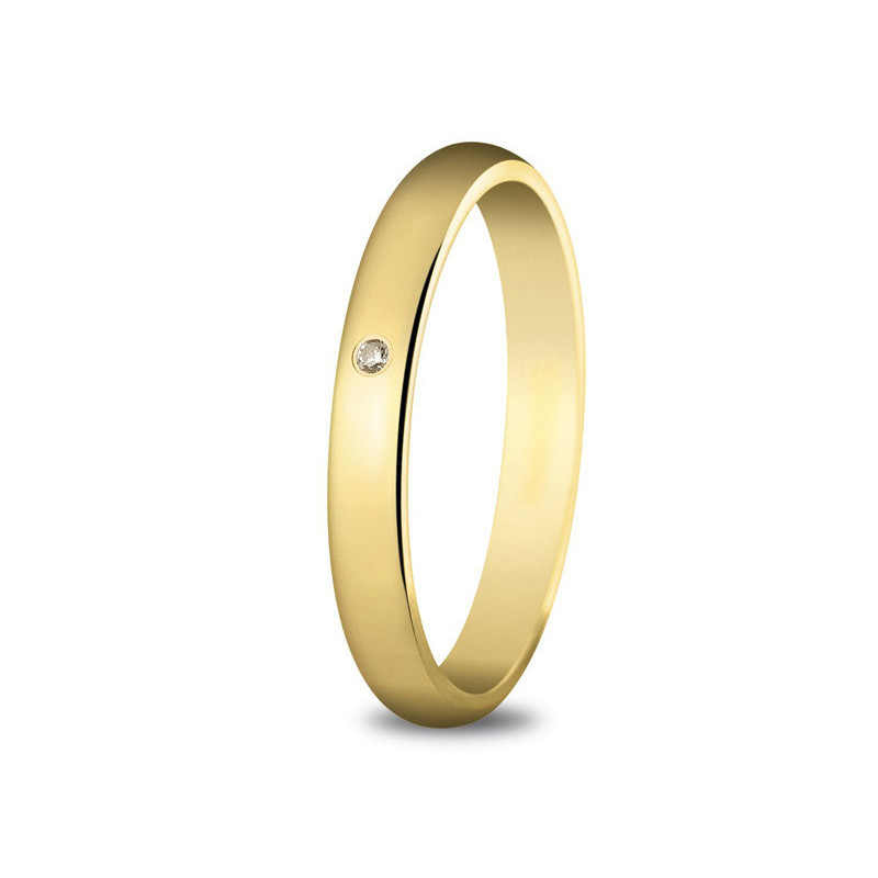 Alliance or jaune 18K plat d'une largeur de 3mm sertie de 1 diamant de forme brillant G-SI pour un poids de 0.02ct. Le poid d'or est de 3.9g