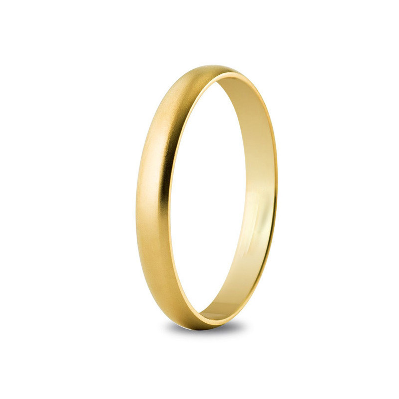 Alliance or jaune 18K d'une largeur de 3mm. Le poid d'or est de 2.8g. La finition est sablée