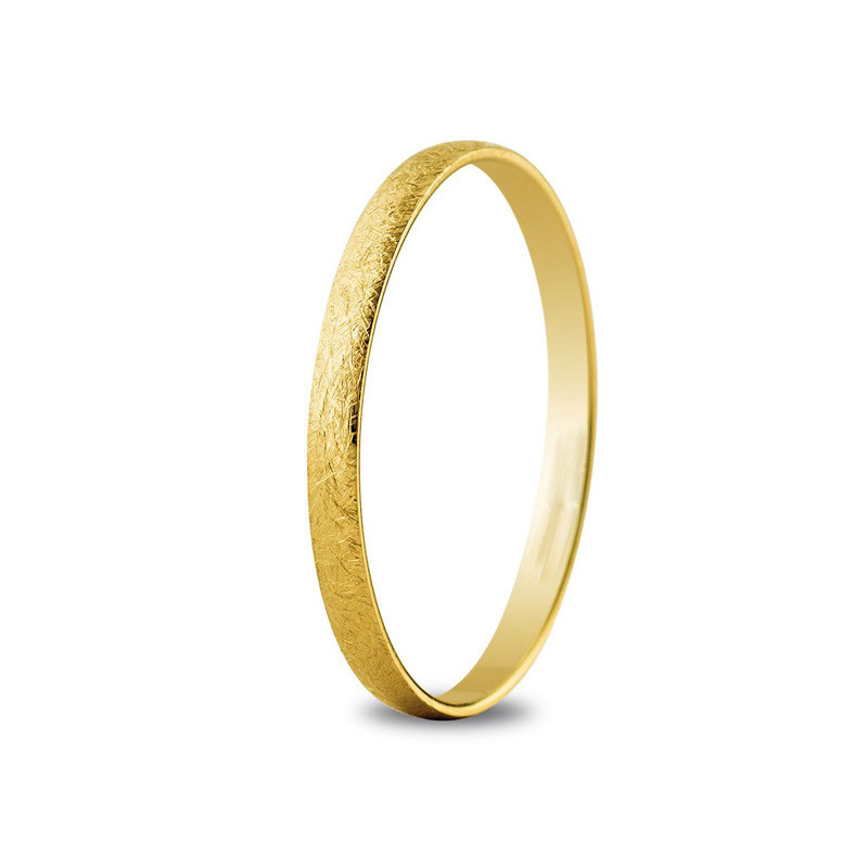 Alliance or jaune 18K d'une largeur de 2mm. Le poid d'or est de 1.27g. La finition est striée