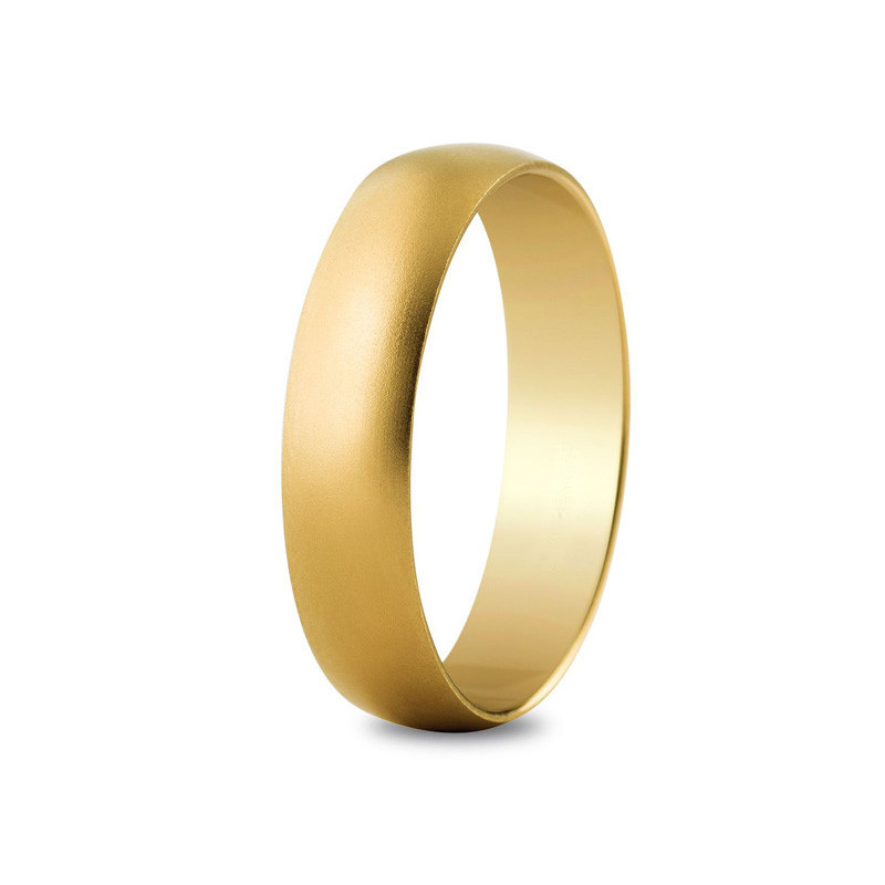 Alliance or jaune 18K d'une largeur de 5mm. Le poid d'or est de 4.62g. La finition est sablée