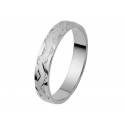 Alliance or blanc palladié 18K d'une largeur de 3 mm. Le poid d'or est de 2.34g. La finition est facettée