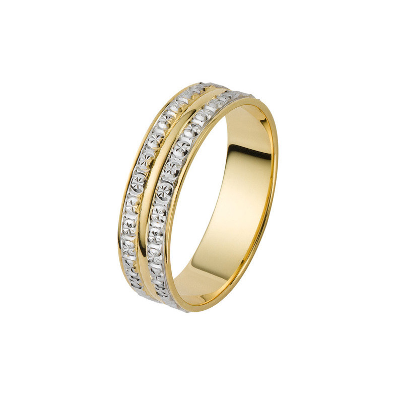 Alliance 2 ors 18K d'une largeur de 5 mm. Le poid d'or est de 4.87g. La finition est facettée