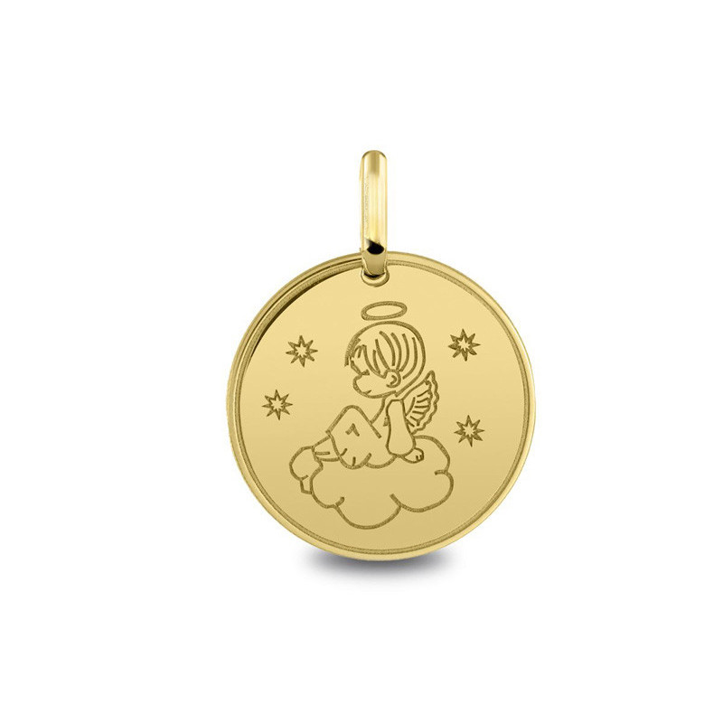 Médaille Ange nuage or jaune 18K laser d'un diamétre de 16mm. Le poid d'or est de 1.25g