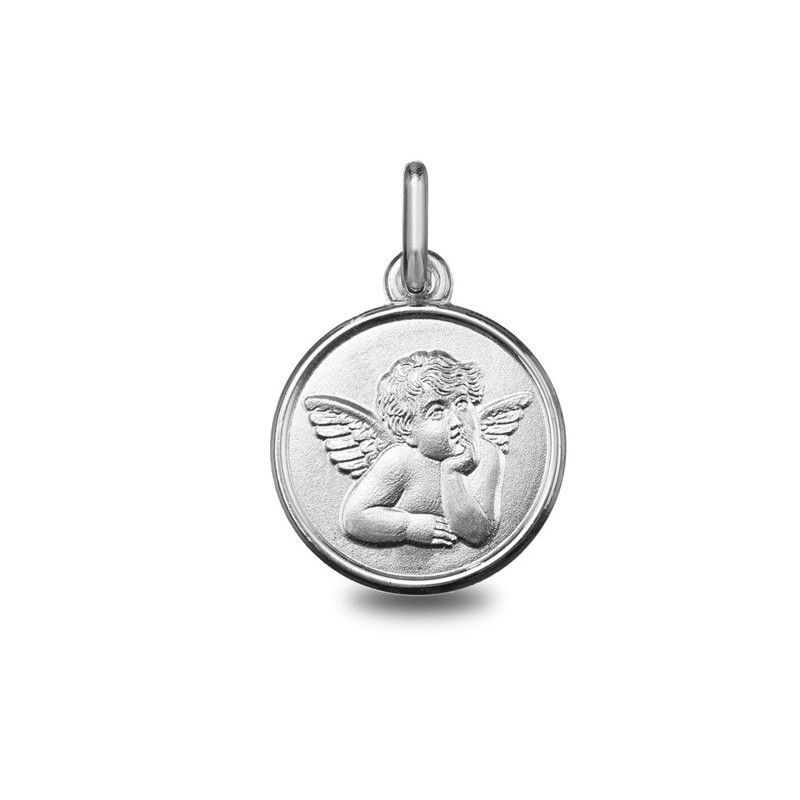 Médaille Ange Raphael or blanc palladié 18K biseautée d'un diamétre de 14mm. Le poid d'or est de 1.40g