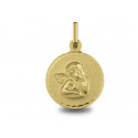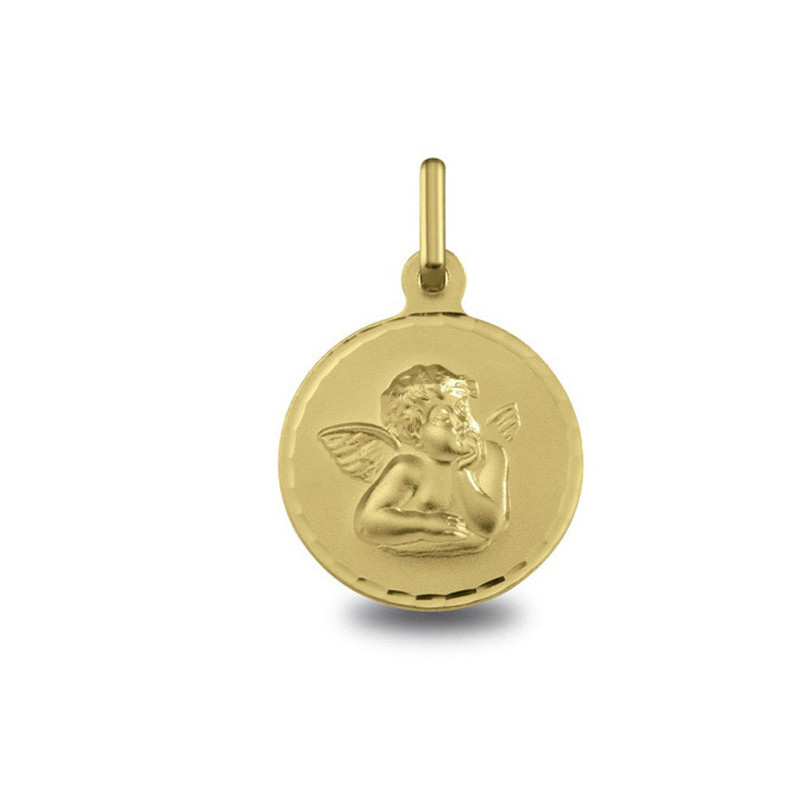 Médaille Ange Raphael or jaune 18K facettée d'un diamétre de 15mm. Le poid d'or est de 1.43g